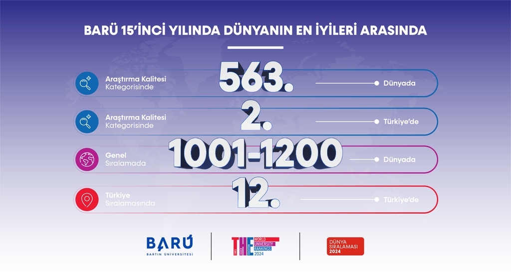 Bartın Üniversitesi (BARÜ) kuruluşunun 15. yılında Times Higher Education (THE) 2024 Dünya Üniversite Sıralamasında ‘Araştırma Kalitesi’ kategorisinde 563. sırada yer alırken, genel sıralamada 1001-1200 bandına girmeyi başardı ve Türkiye’nin en iyi 12. üniversitesi oldu.